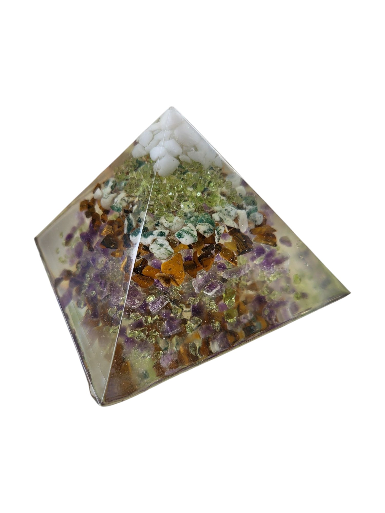 Geeft bescherming tegen negatieve stralingen uit bronnen zoals routers, computers en telefoons. Reinigt je chakra’s en aura en brengt ze weer in balans. Een Orgonite kan helpen tegen slapeloosheid en nachtmerries en hij versterkt de werking van de aanwezige edelstenen.